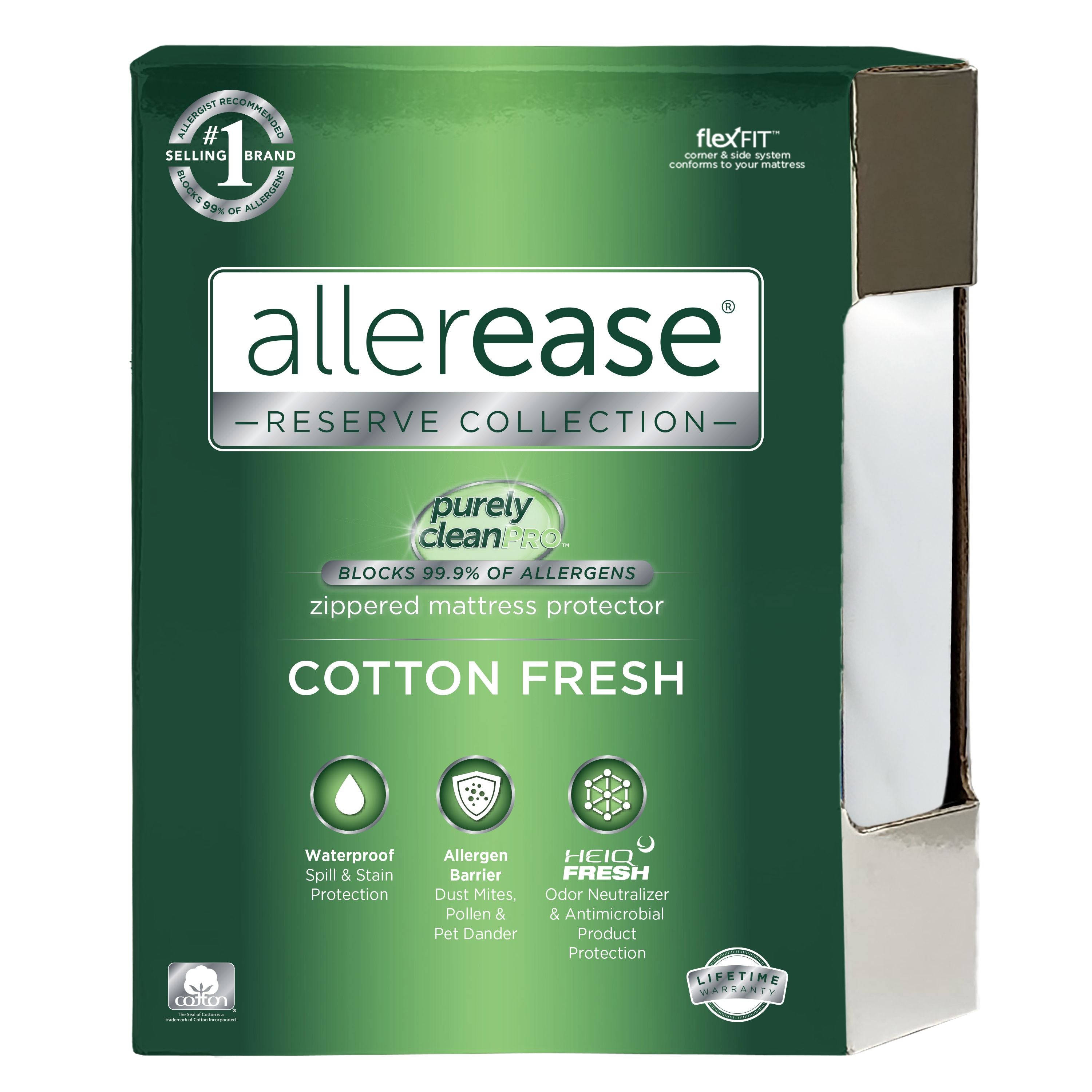 The AllerEase Cotton Fresh Antimicrobial Mattress Protector not only protects your mattress but helps to keep it fresher between washes. The allergen barrier fabric protects your mattress from dust mites, pollen, and pet dander while offering waterproof protection. The cotton top fabric is quiet, soft, and finished with FreshTech technology that eliminates environmental, pet, body, and other odors for freshness between washings.