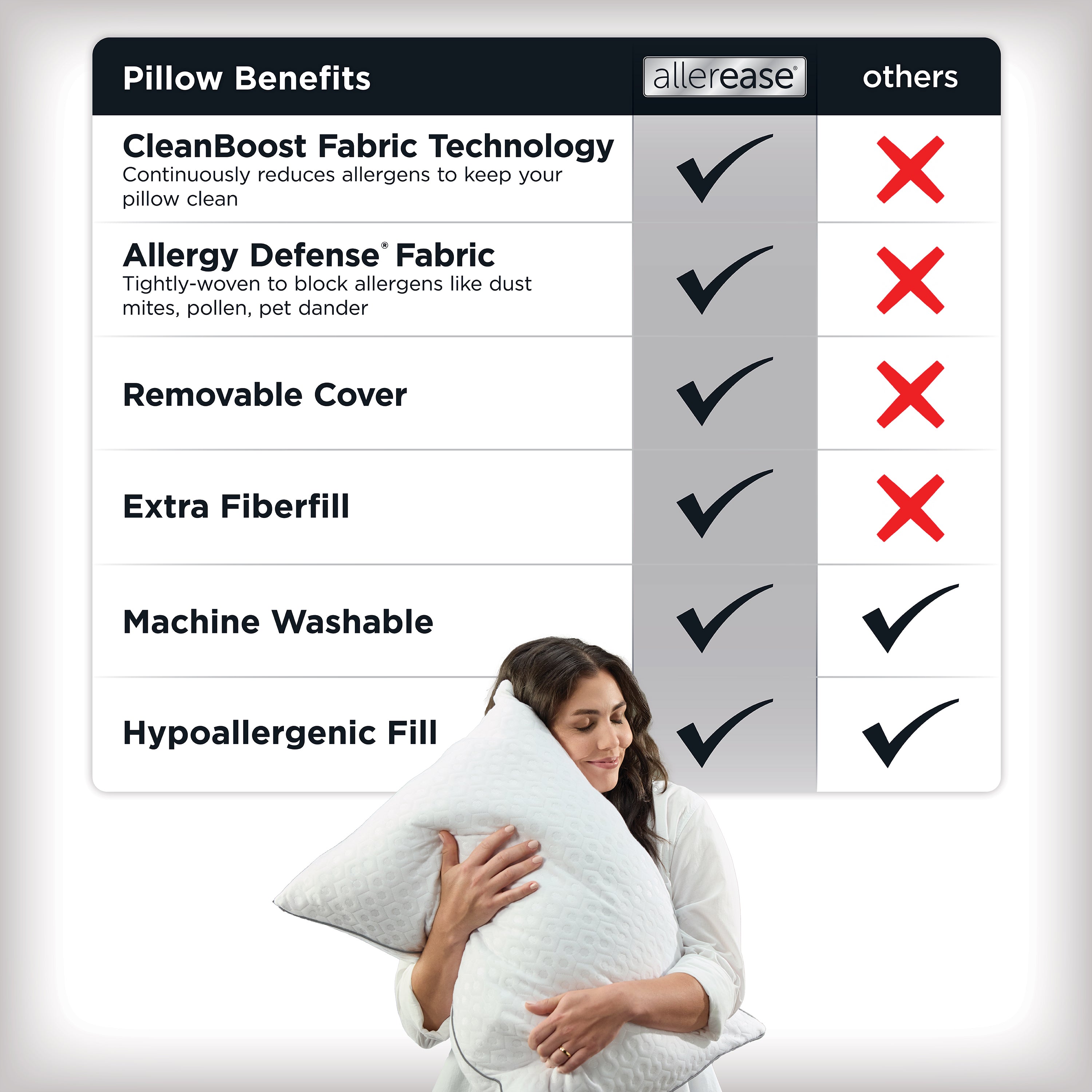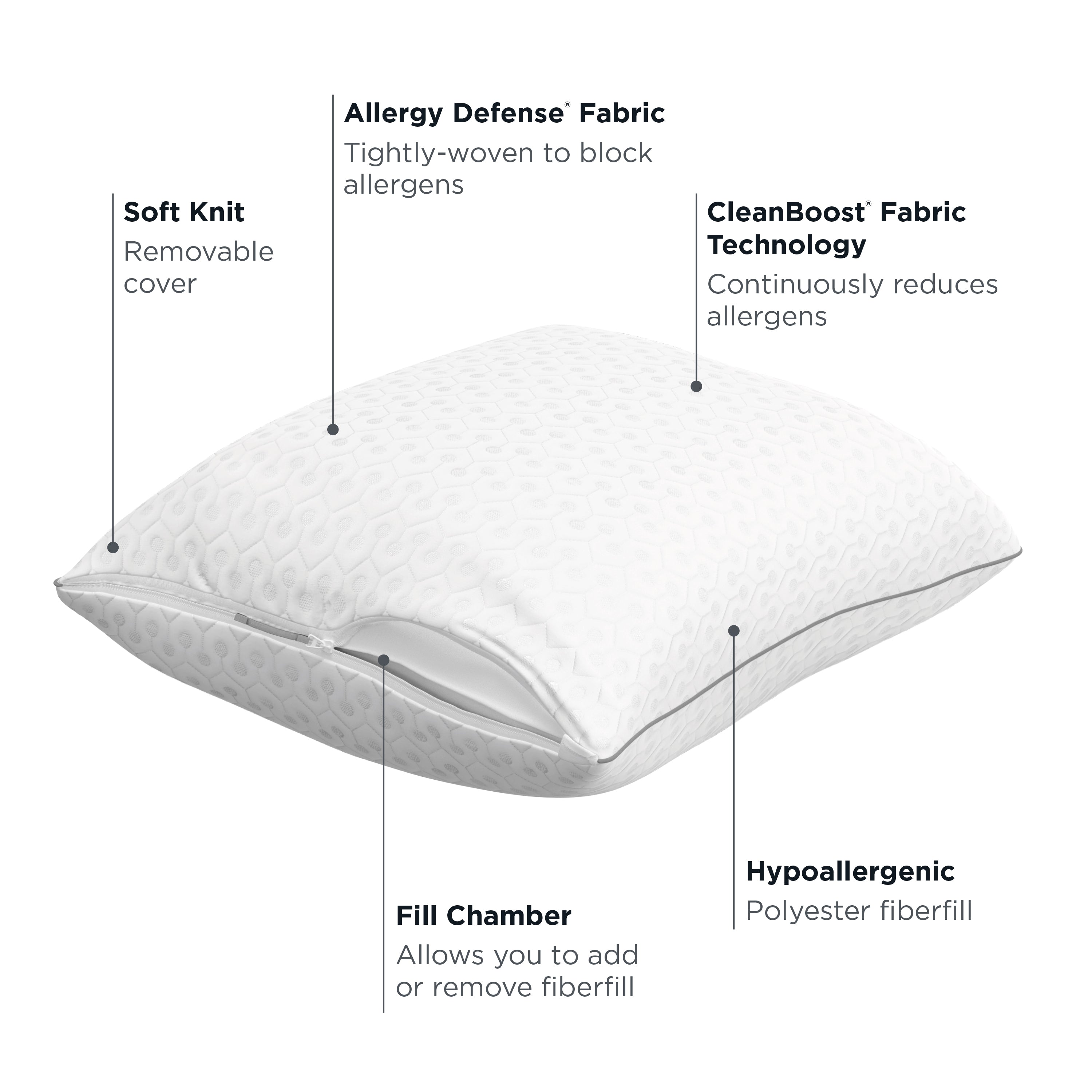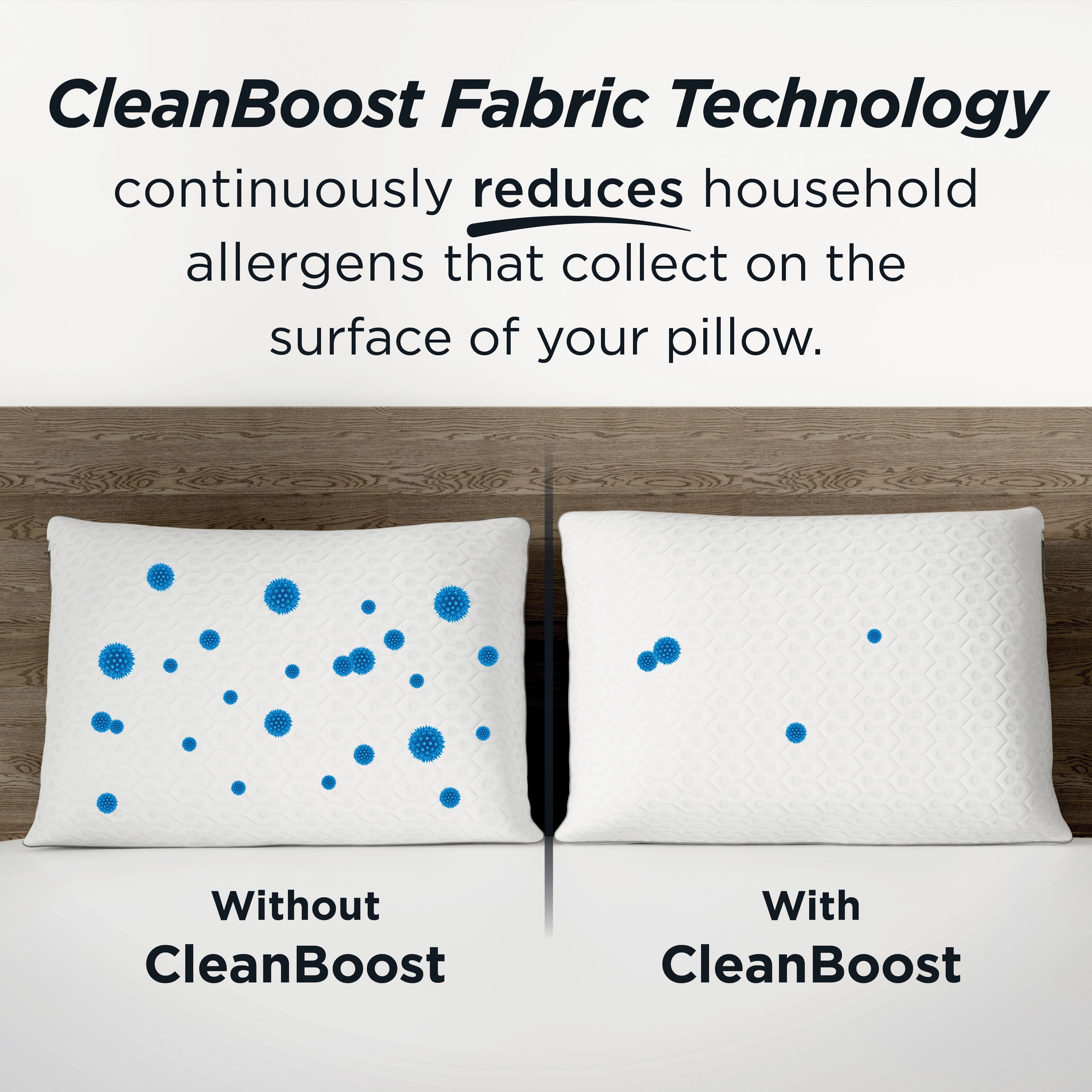 CleanBoost Technology continuously reduces allergens on your pillow surface